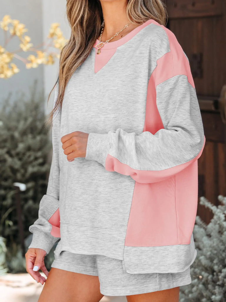 Color Block Long Sleeve Sweatshirt and Shorts Set