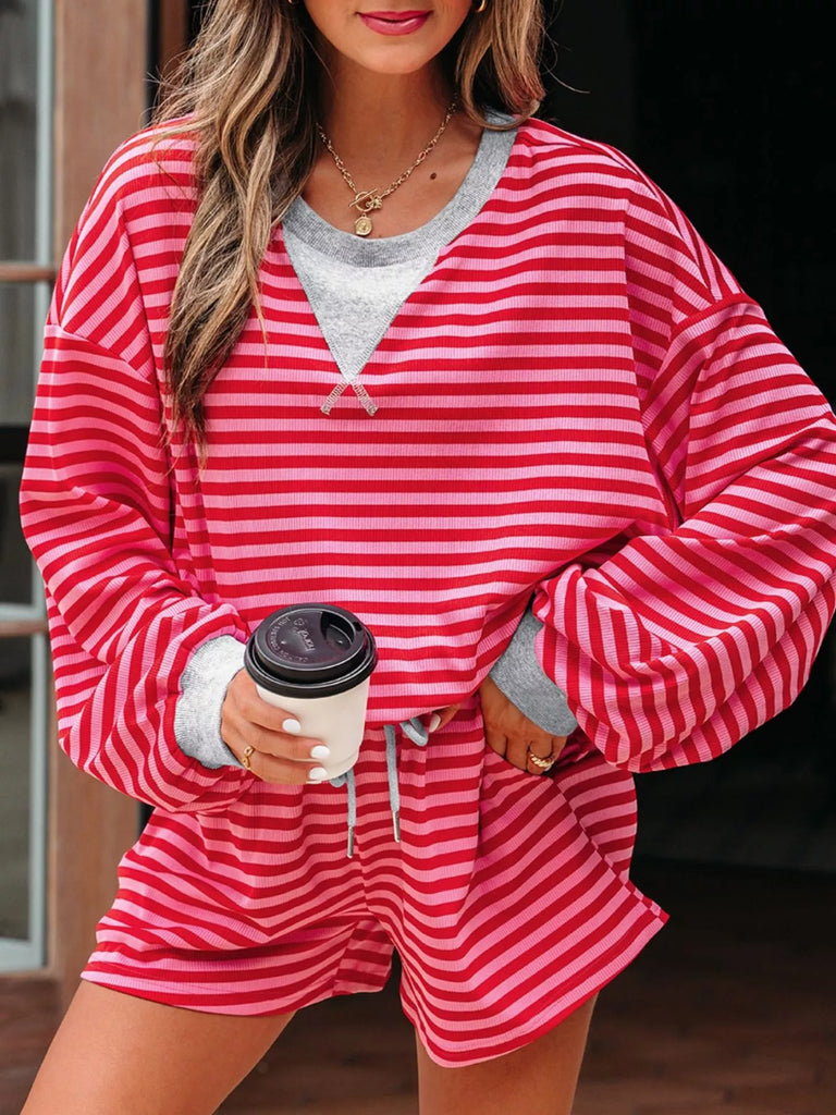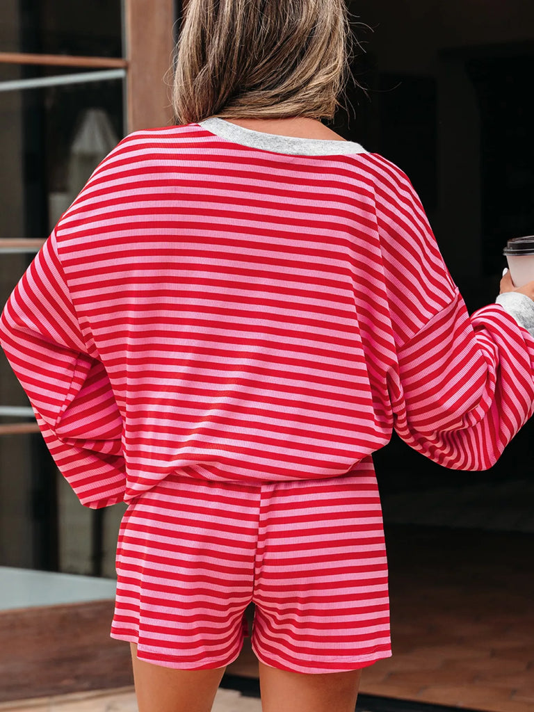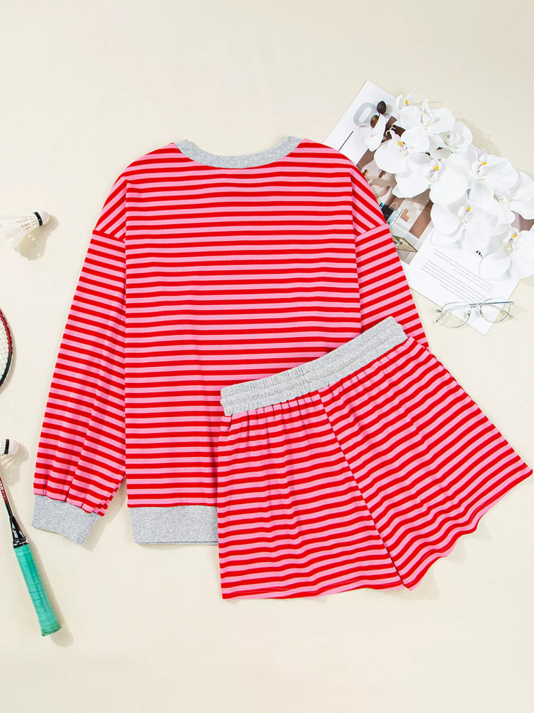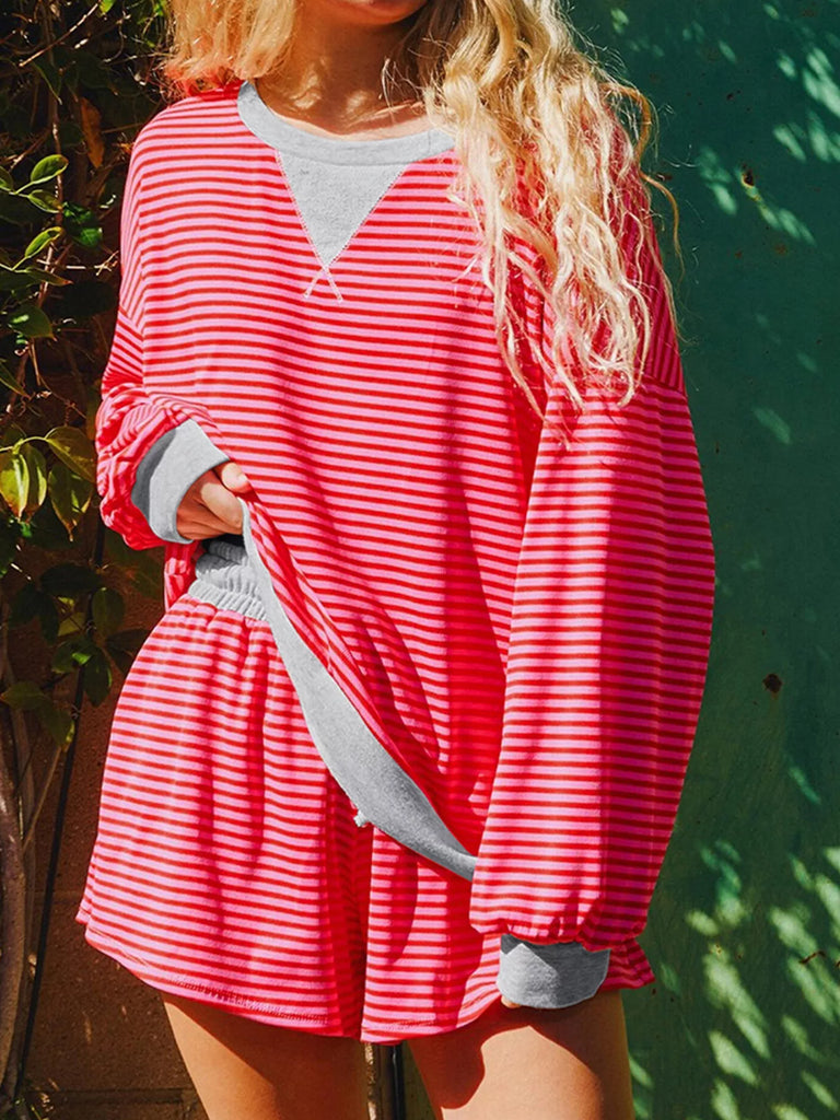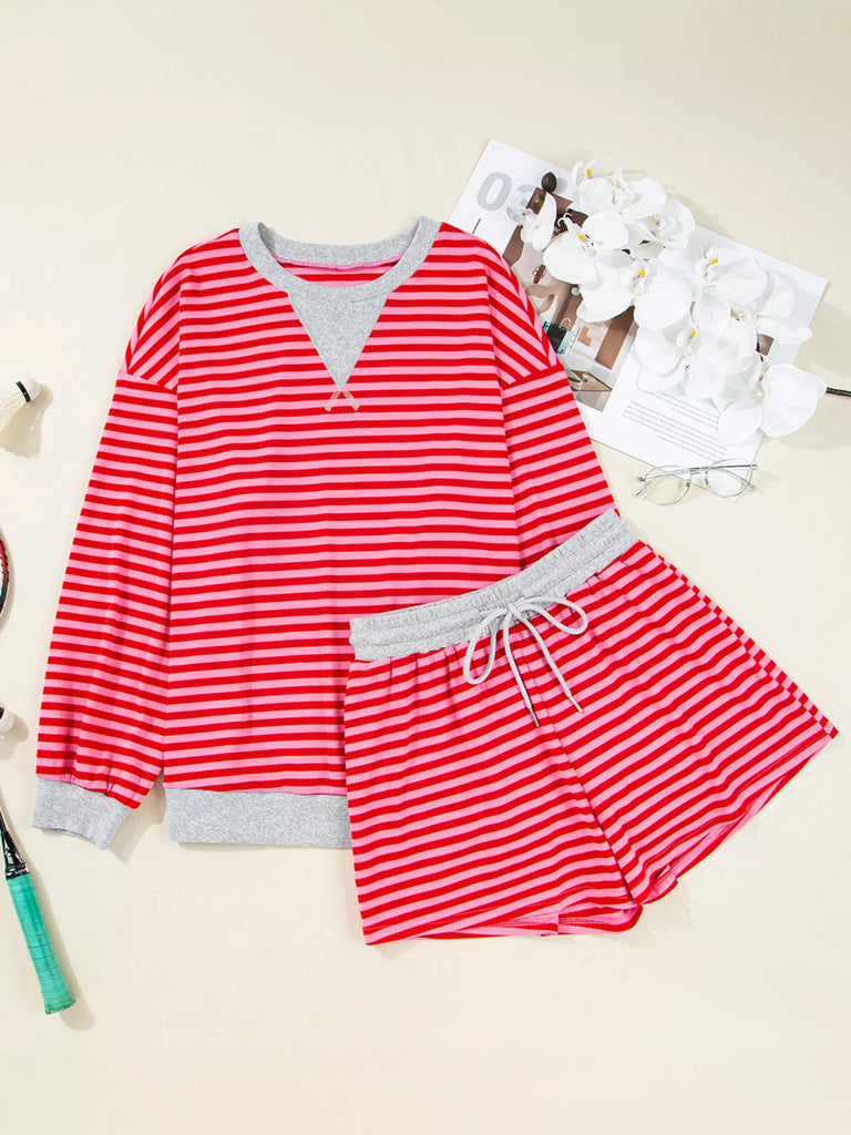 Stripe Drop Shoulder Baggy Top and Shorts Casual Set
