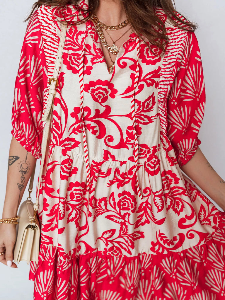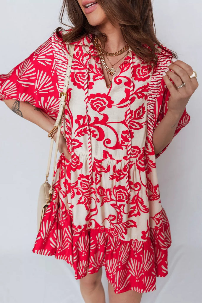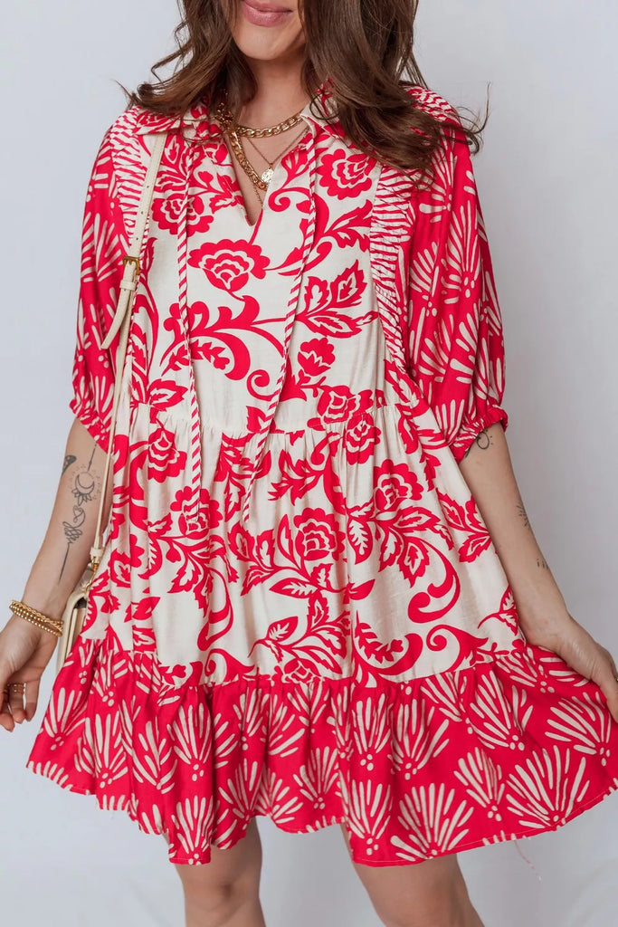 Collared V Neck Half Sleeve Loose Flower Mini Dress