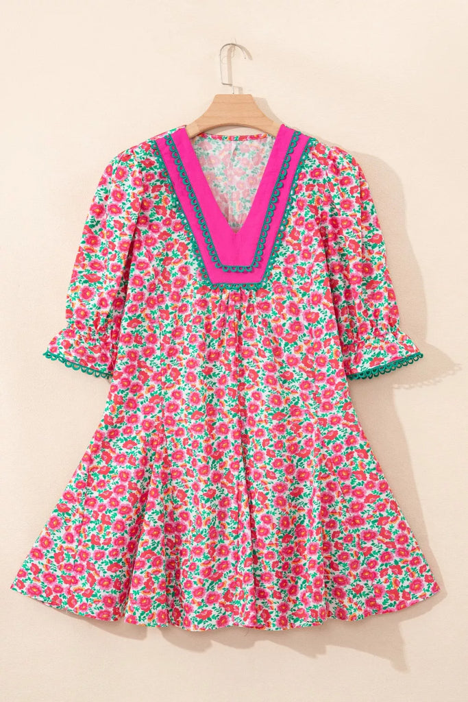Floral Print V Neck Patchwork Short Bubble Sleeve Mini Dress