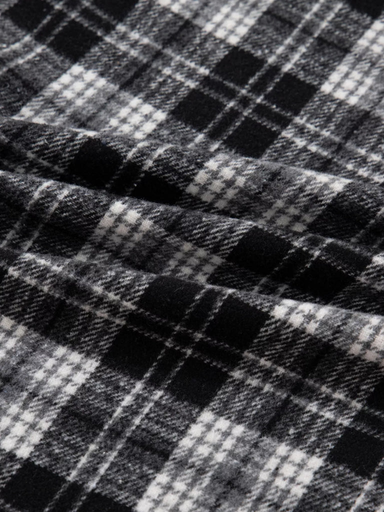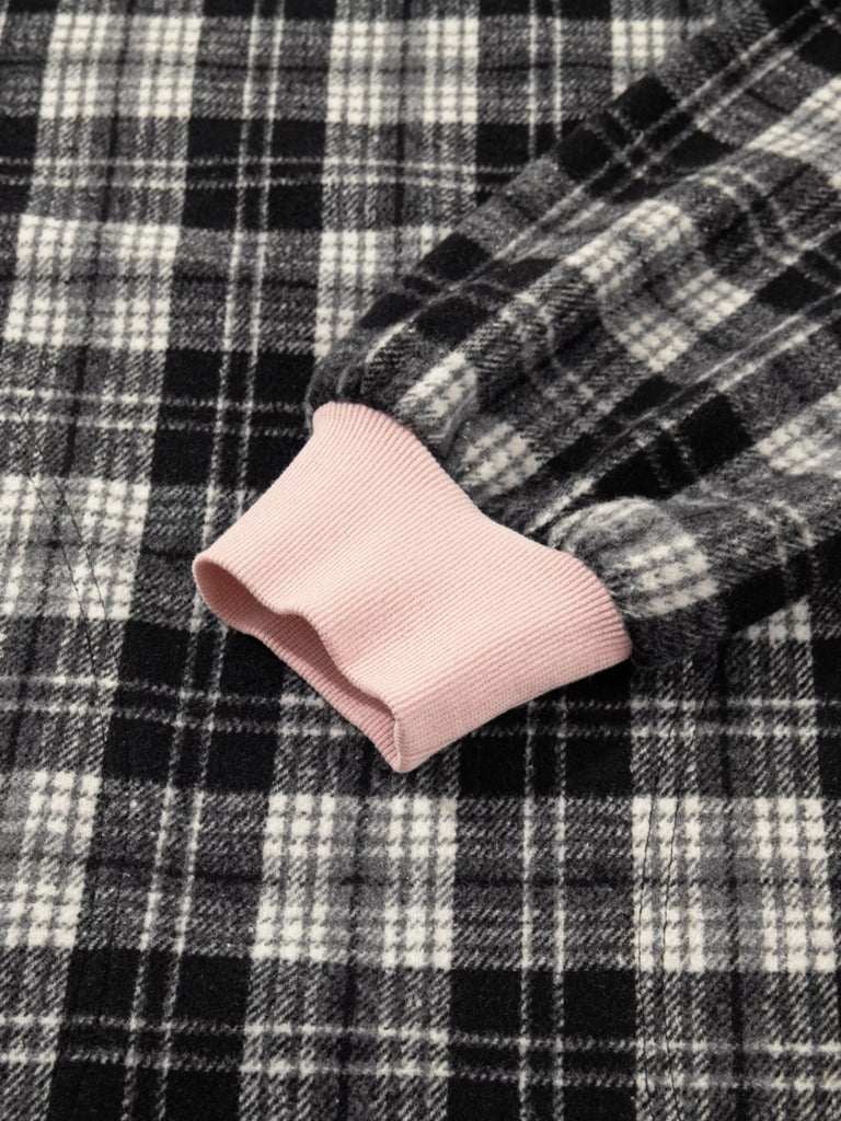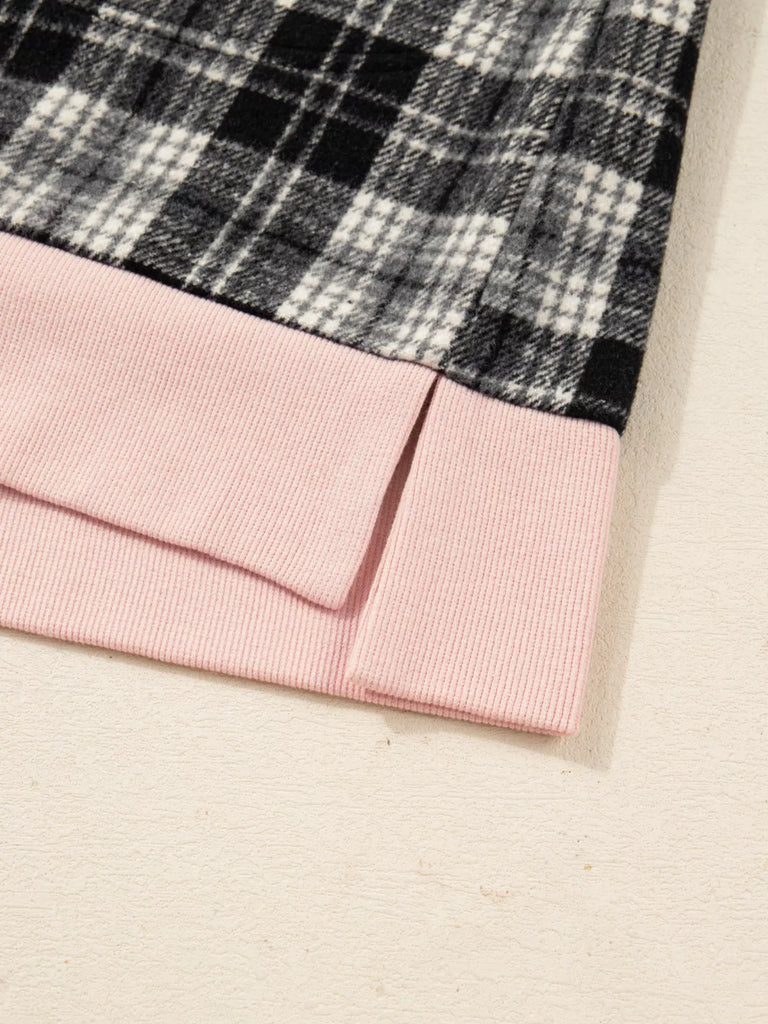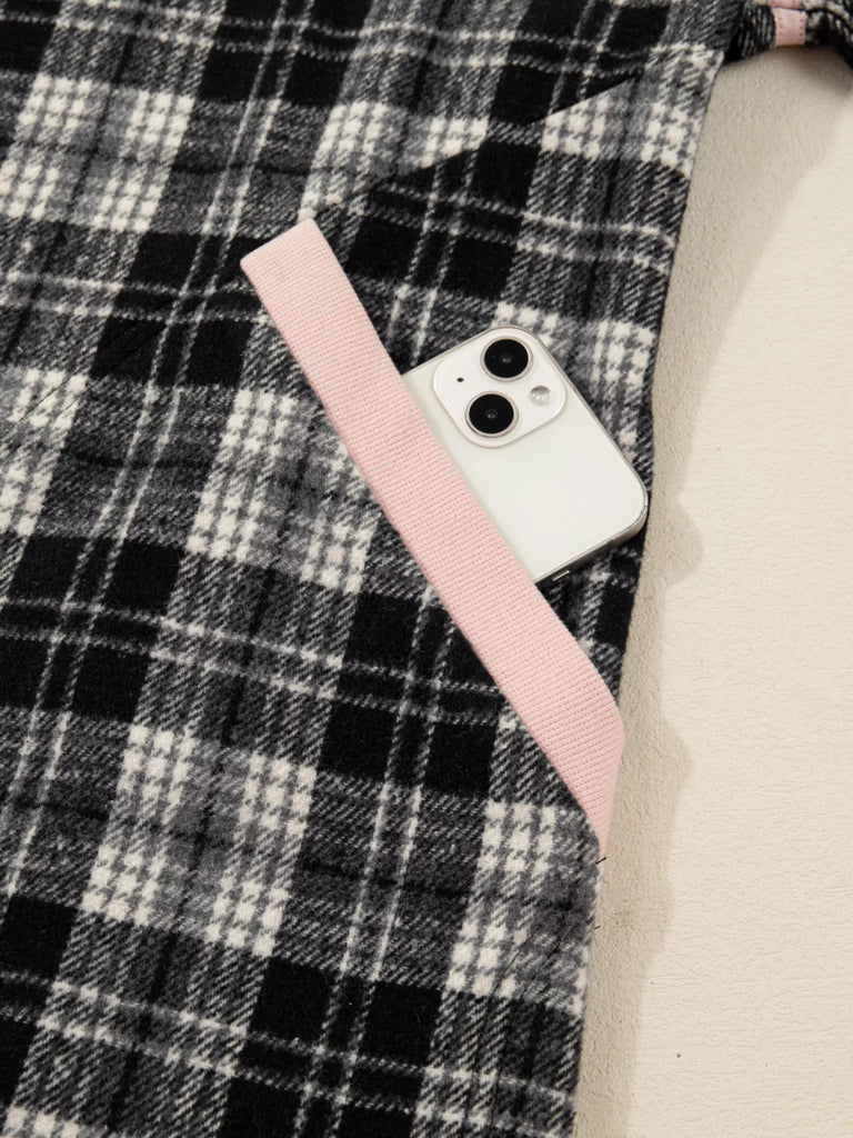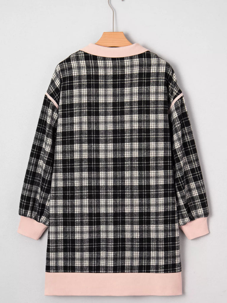 Plaid Polo Collar Zip up Contrast Trim Shift Long Sleeve Mini Dress