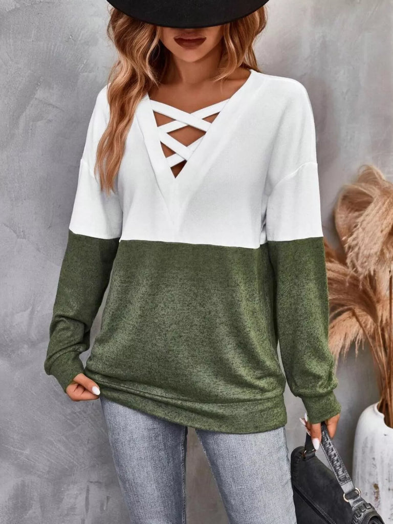 Crisscross V-Neck Color Block Long Sleeve T-Shirt