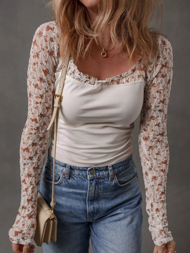 Floral Lace Patchwork Square Neck Long Sleeve Top