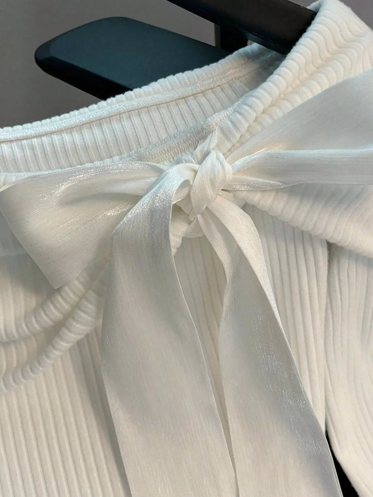 Off-Shoulder Bowknot Ribbed Knit T-Shirt