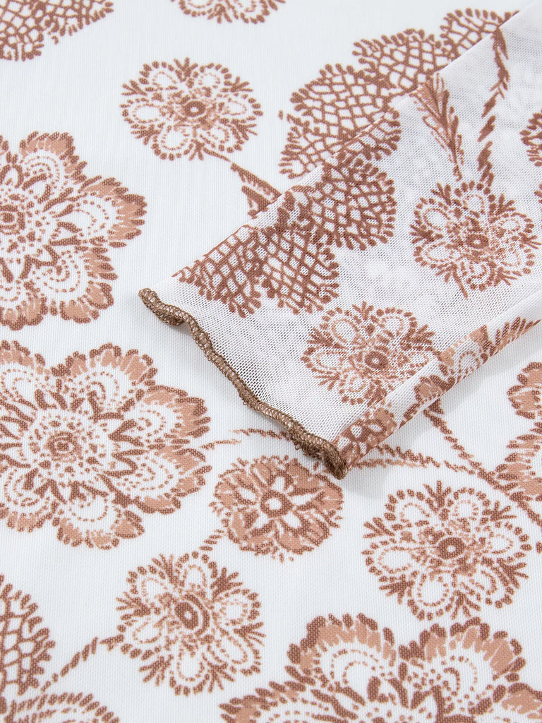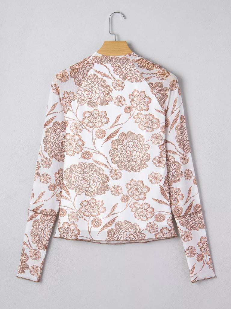 Thumbhole Long Sleeve Floral Print Mesh Top
