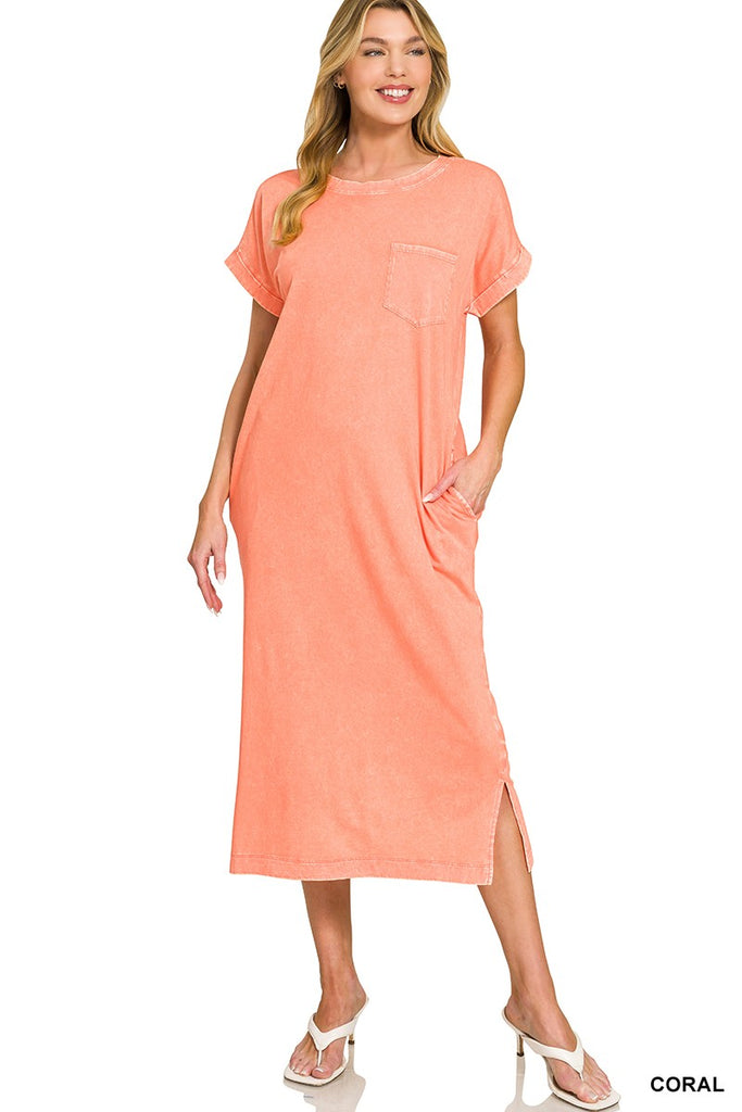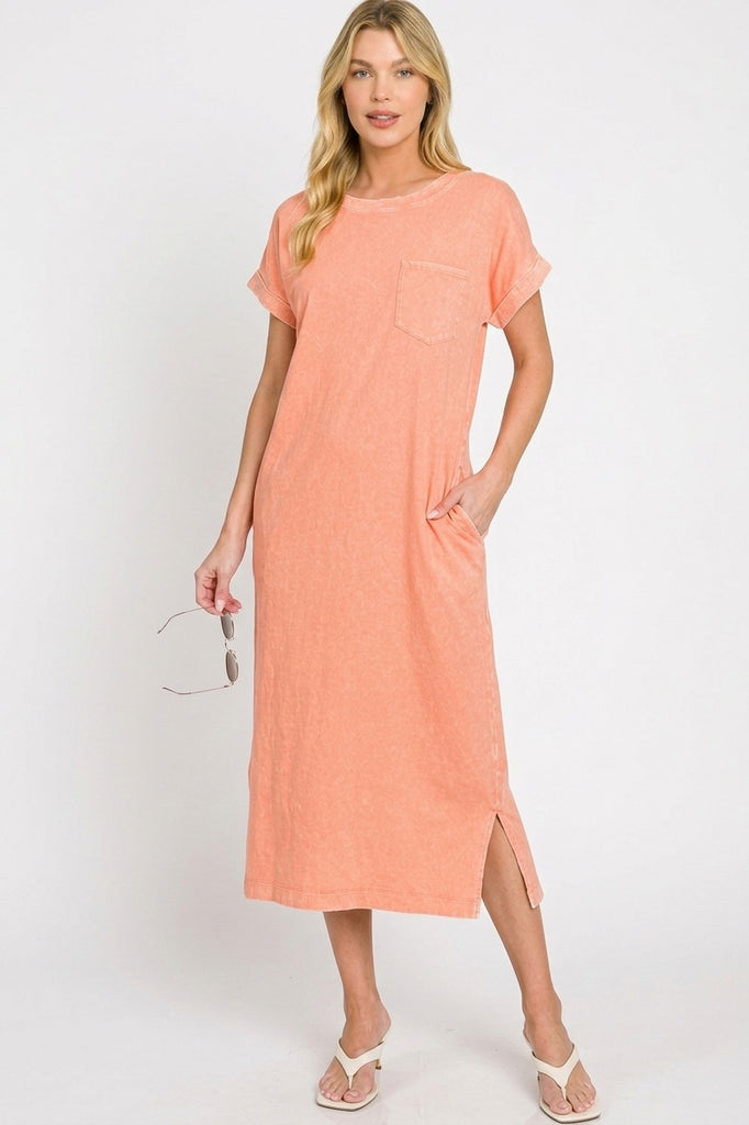 The Washed Exposed Seam Short Sleeve T-shirt Dress is a casual and trendy choice for everyday wear. Featuring exposed seams for a stylish twist, this dress offers a laid-back and relaxed look. The washed finish adds a touch of vintage charm to the design, creating a fashionable and effortless vibe. With short sleeves and a comfortable fit, this dress is perfect for dressing up or down for various occasions. Enjoy both comfort and style with this versatile and on-trend T-shirt dress option.