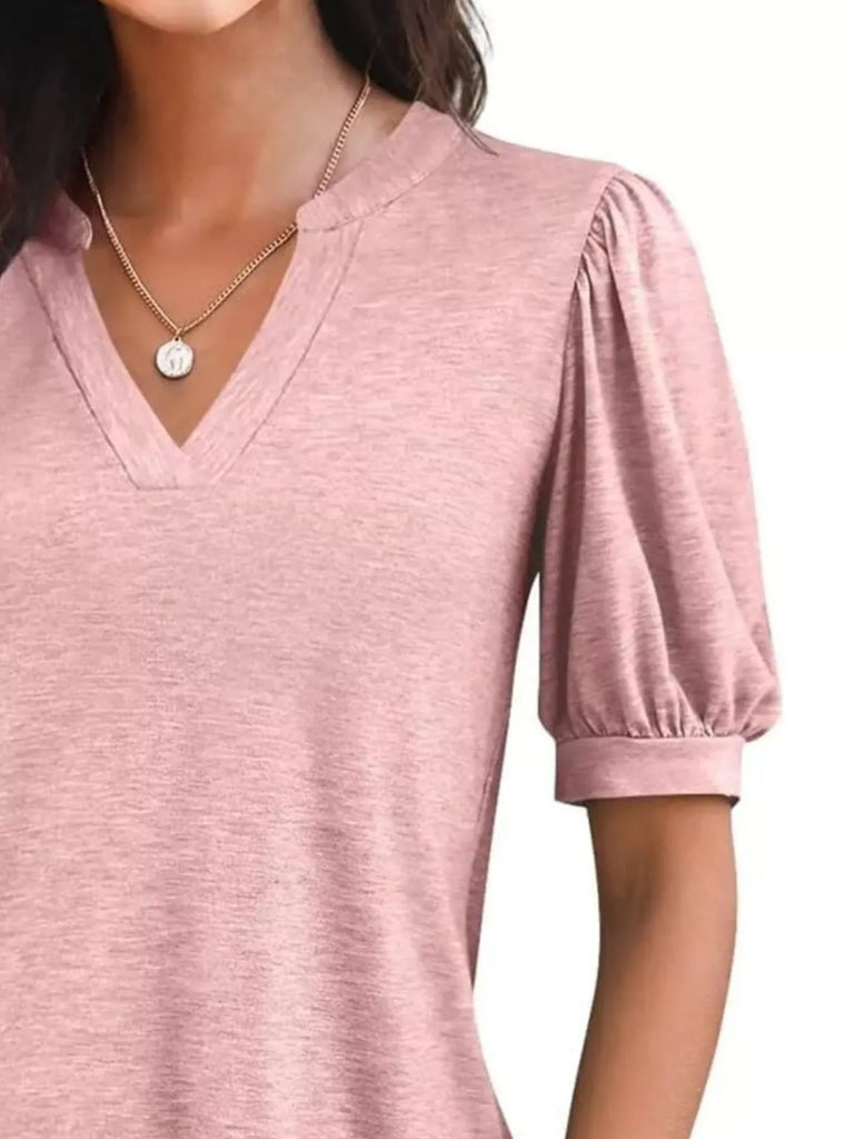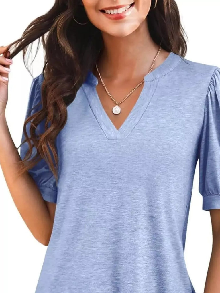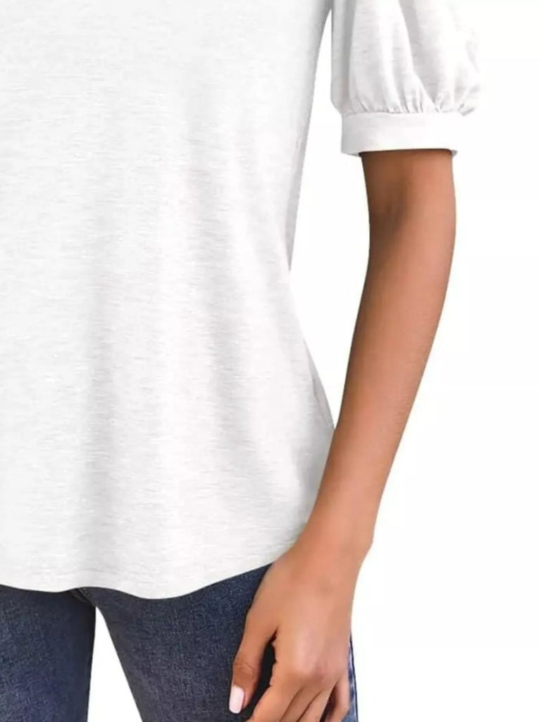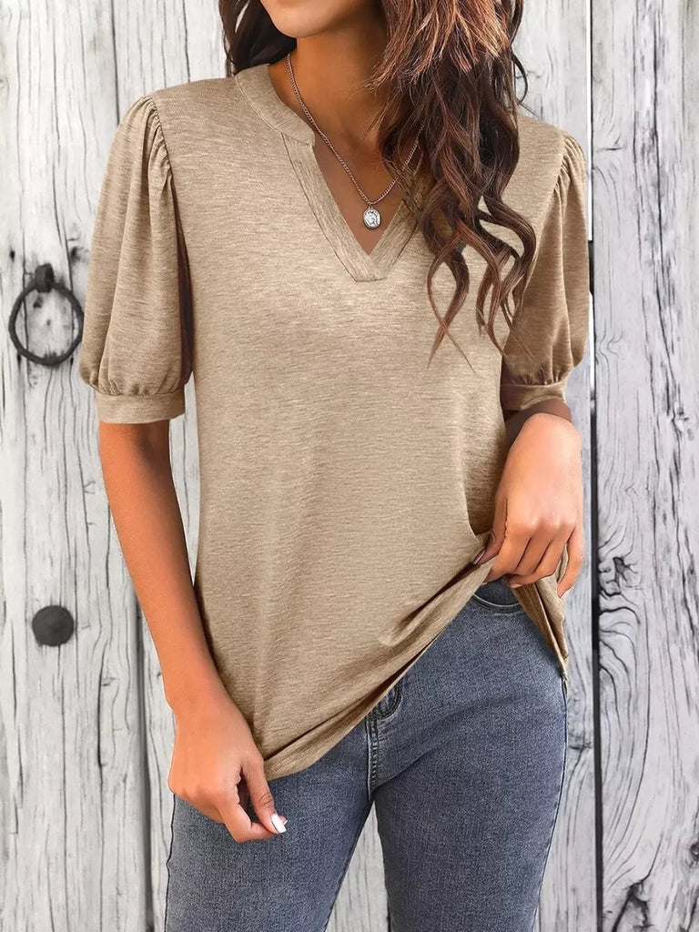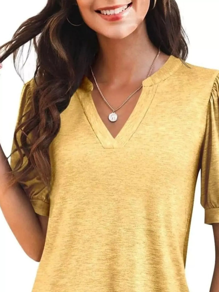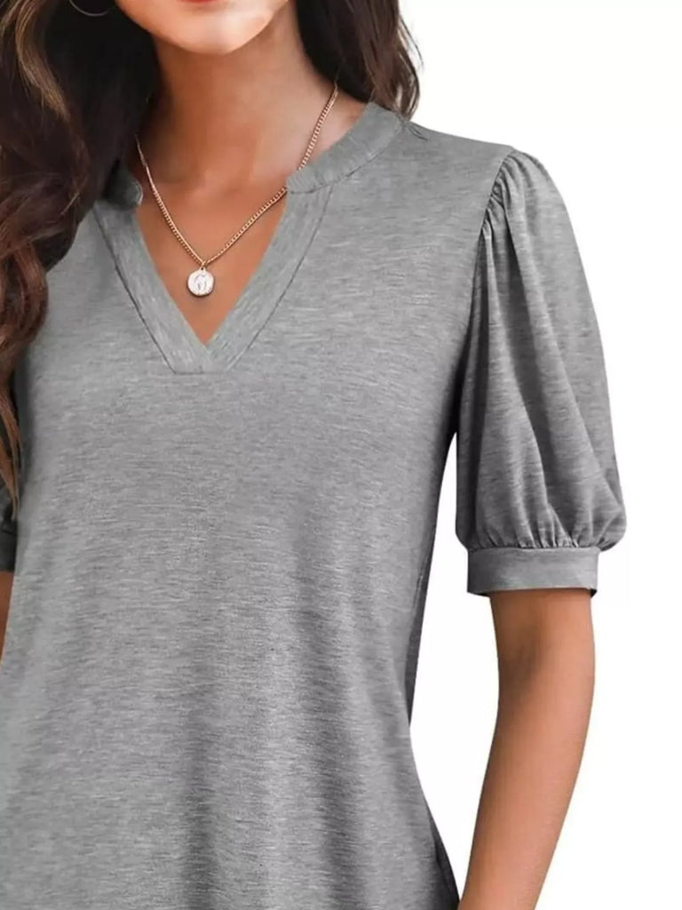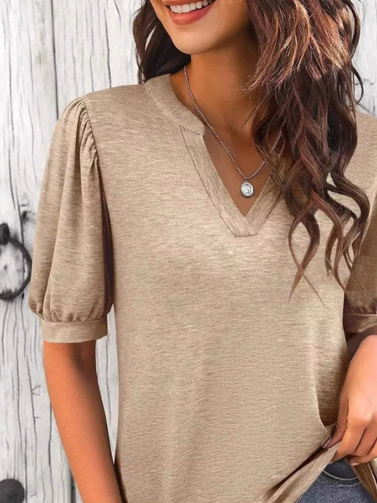 Puff Sleeve Notched Casual T-Shirt