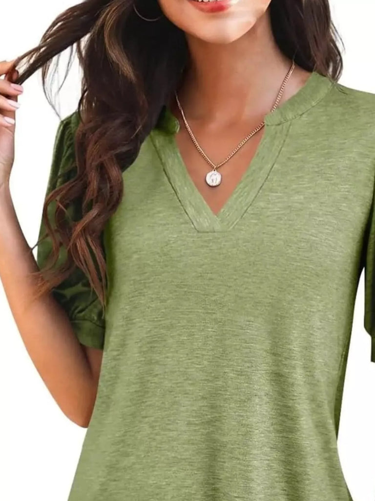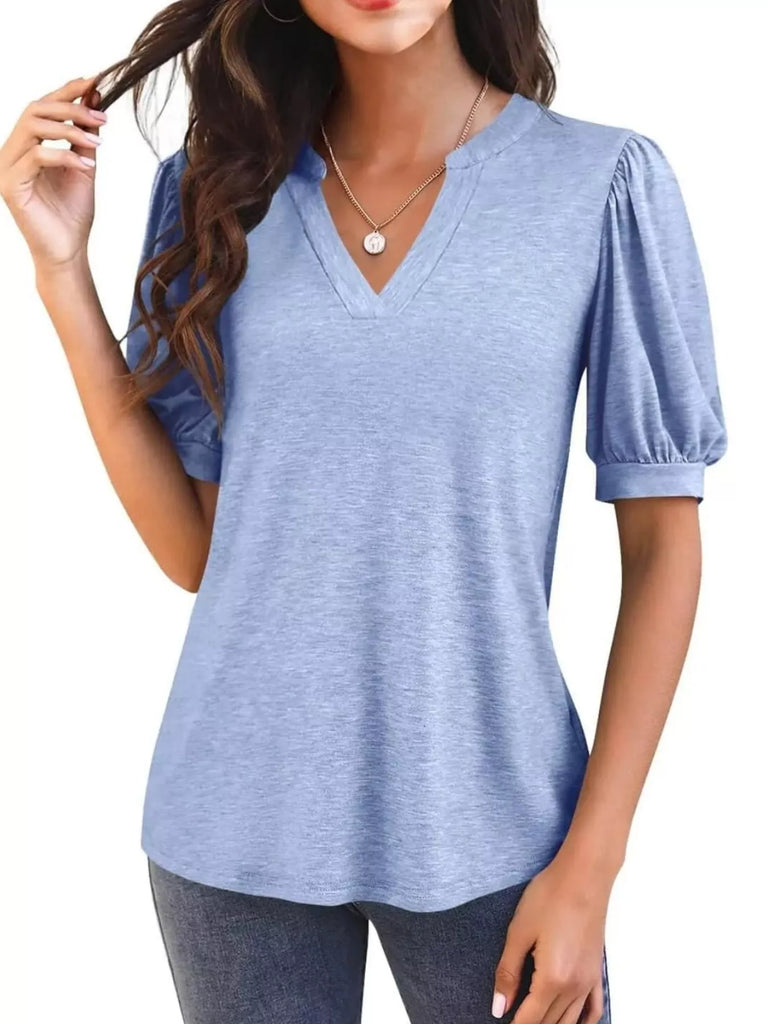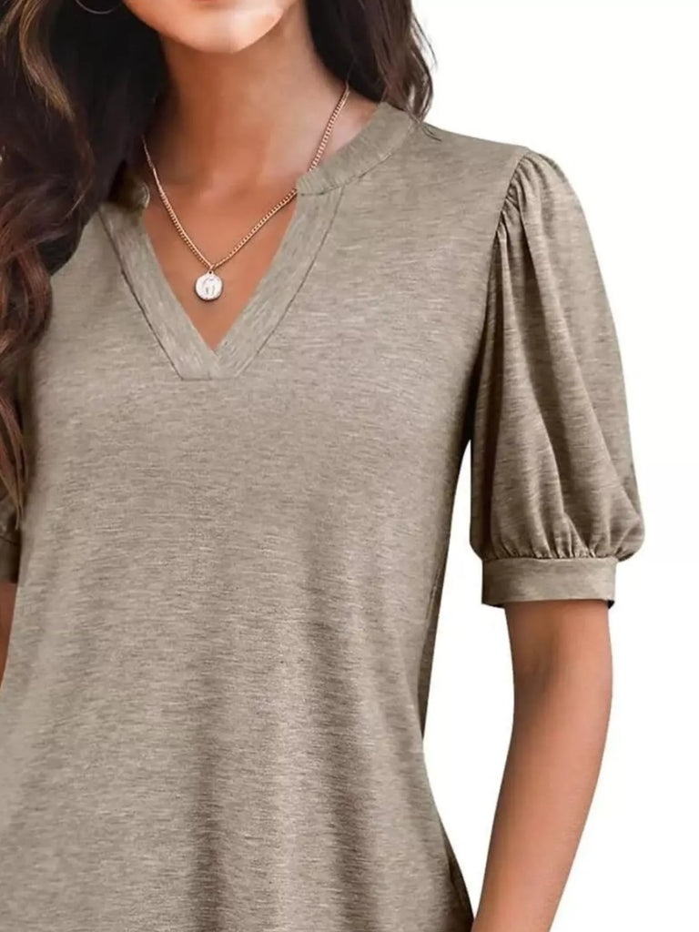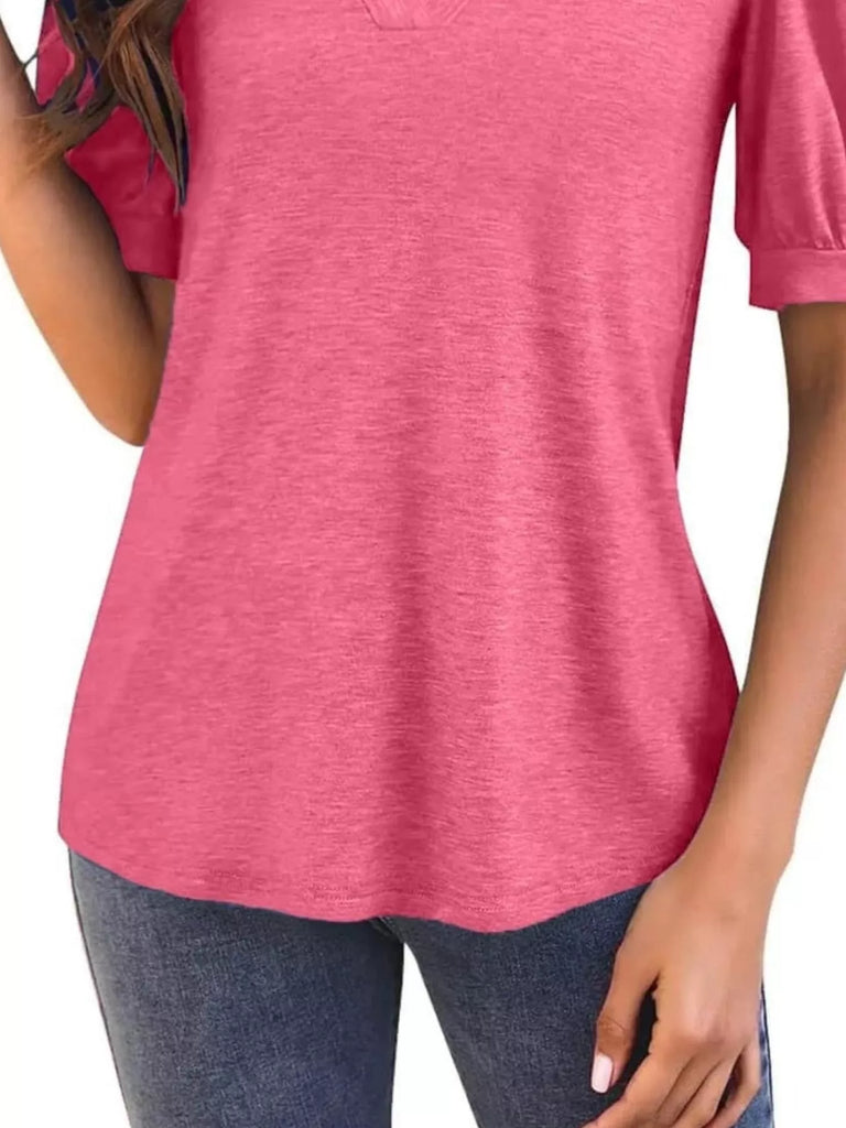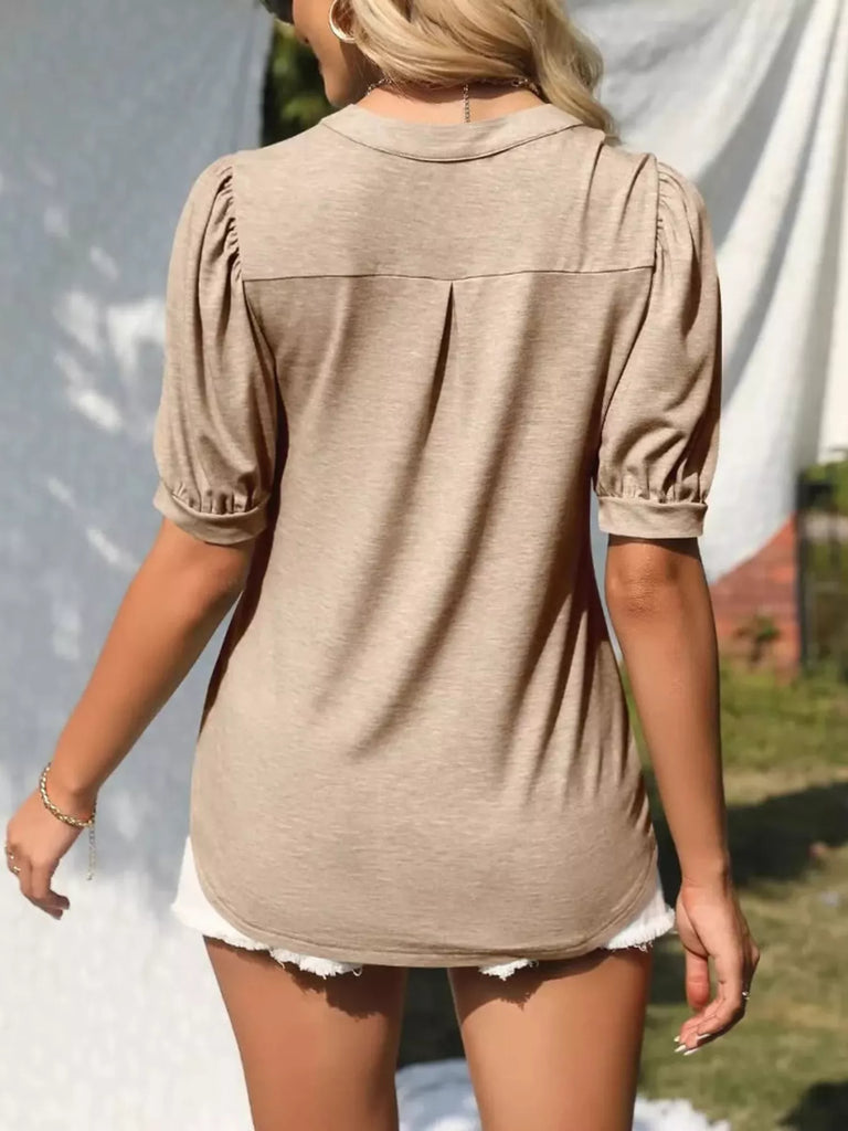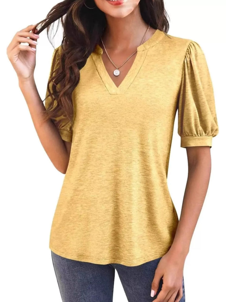 Puff Sleeve Notched Casual T-Shirt