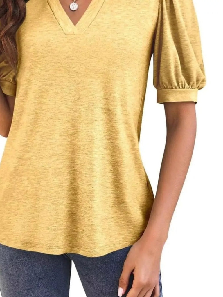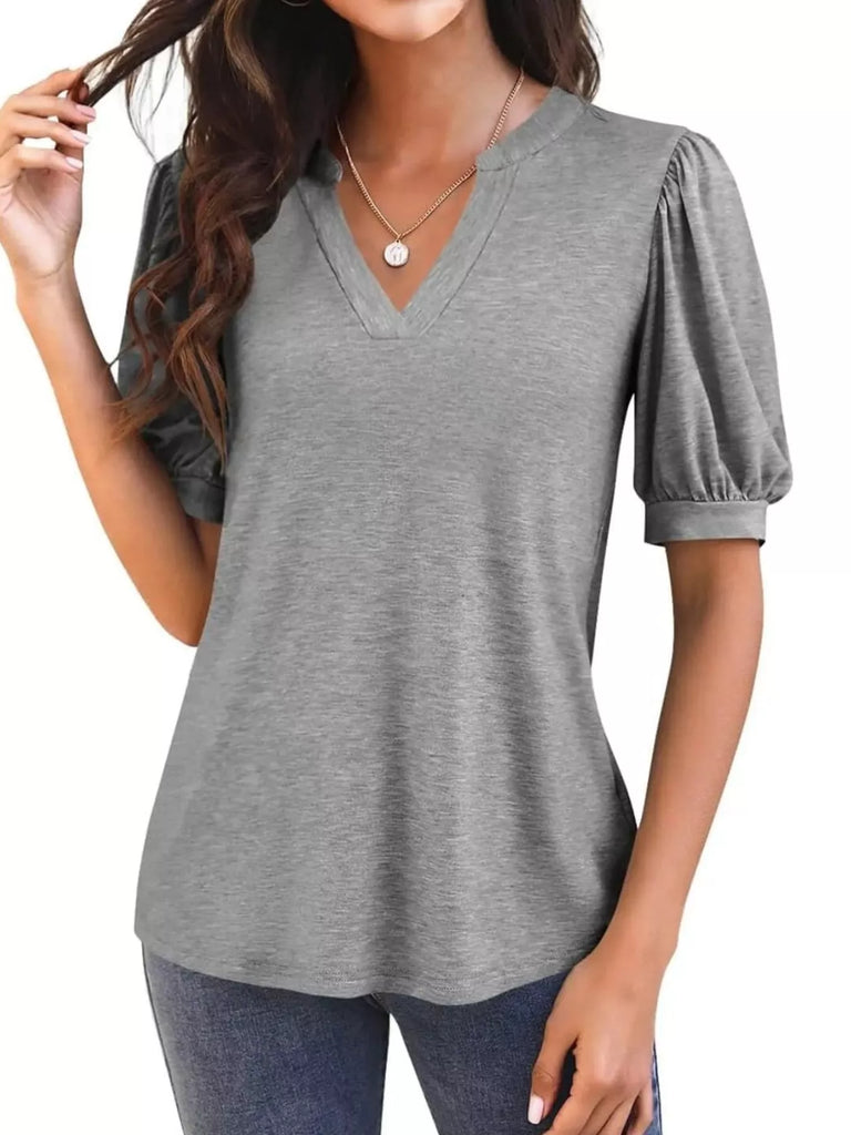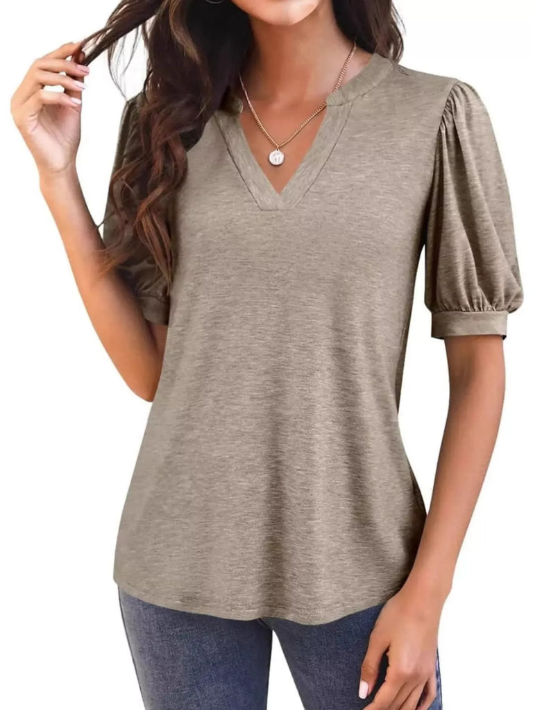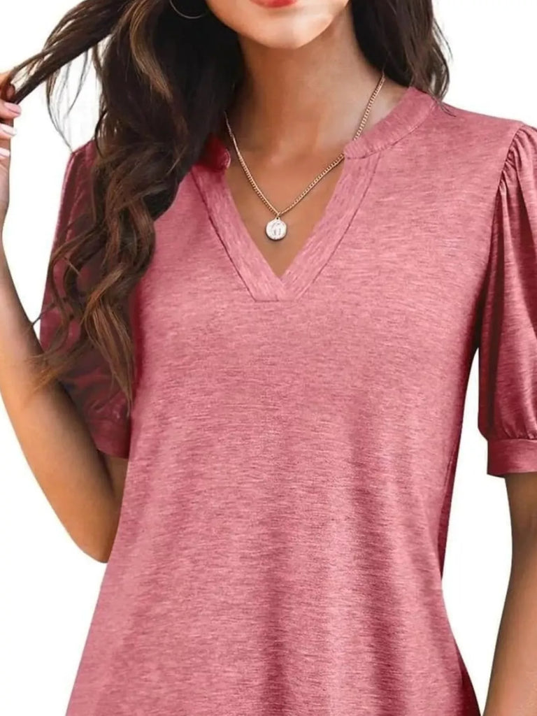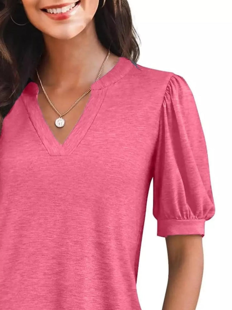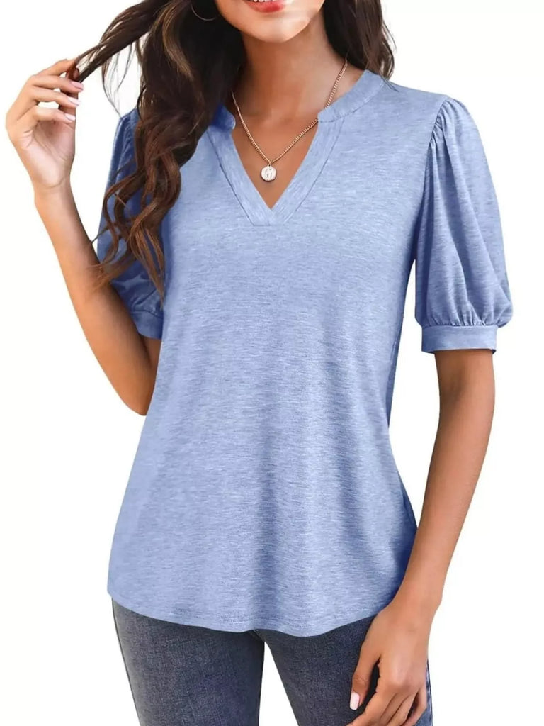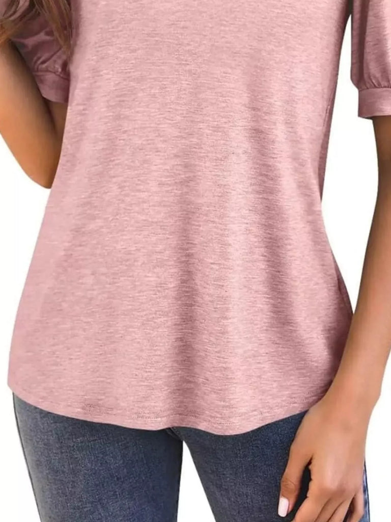 Puff Sleeve Notched Casual T-Shirt