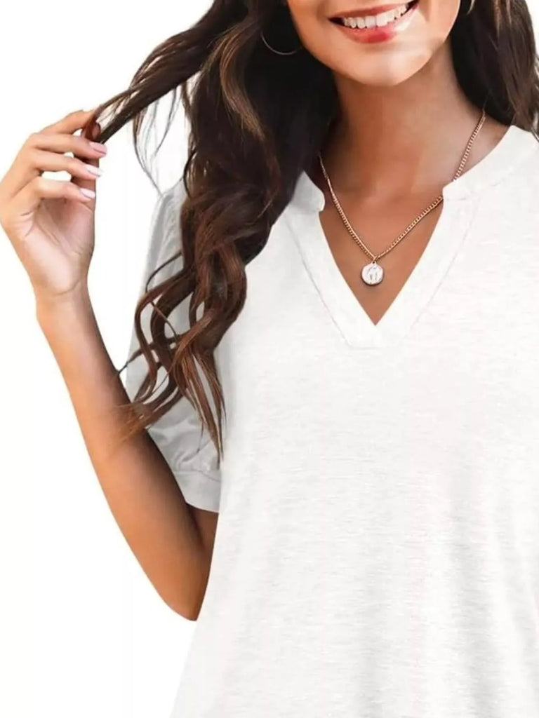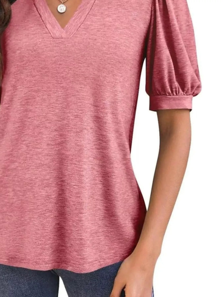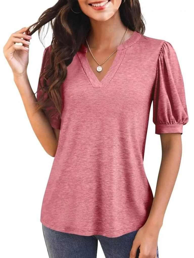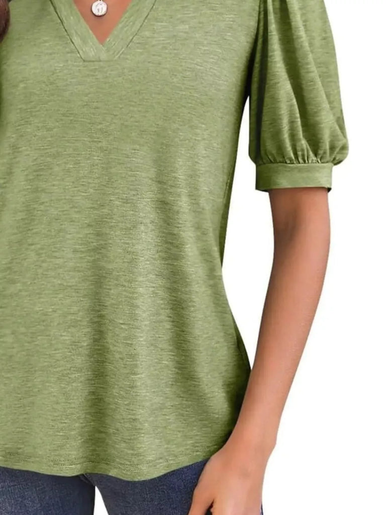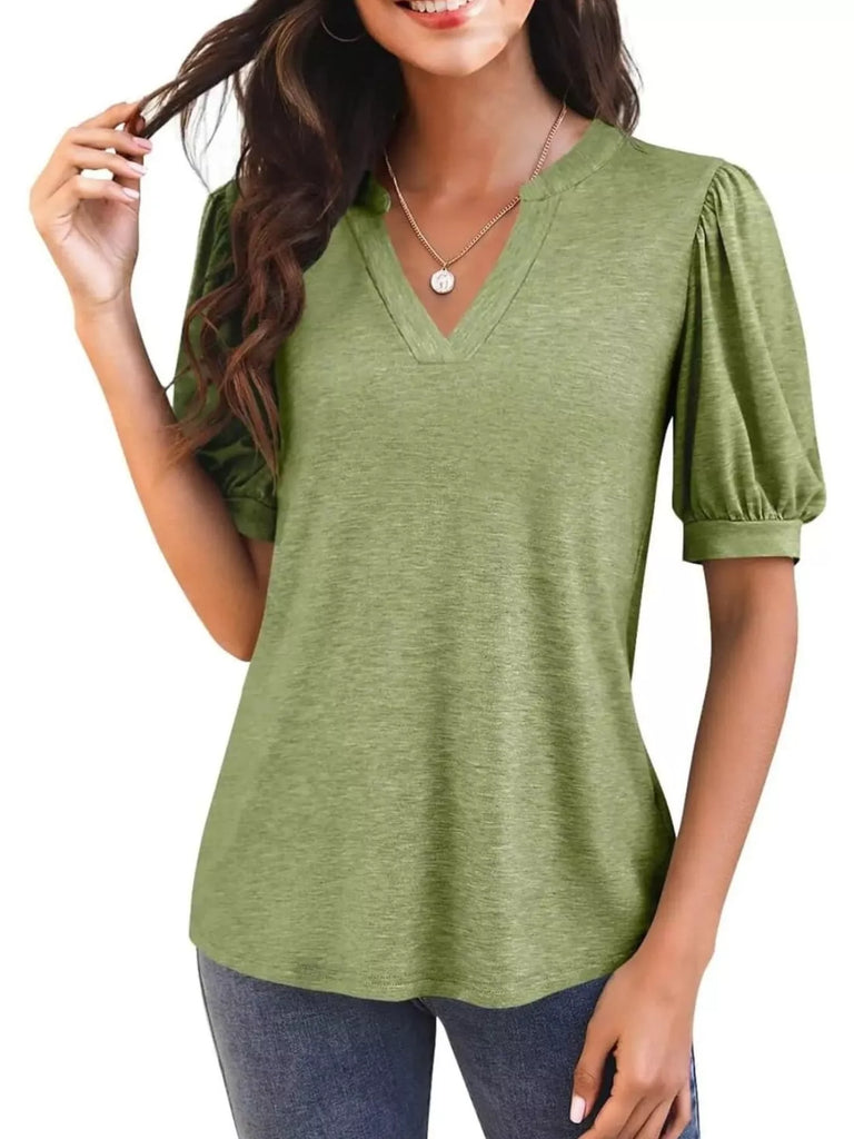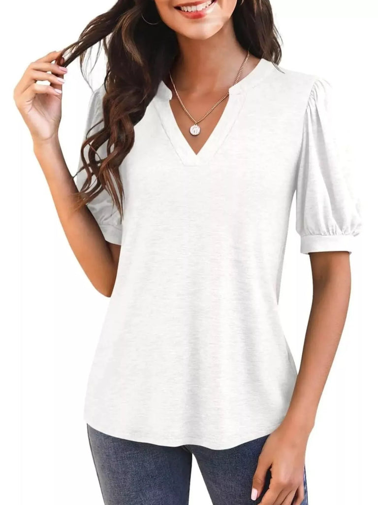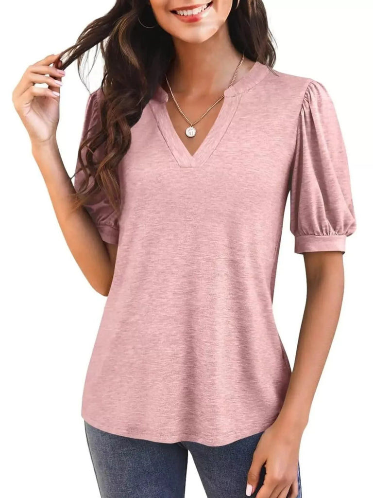 Puff Sleeve Notched Casual T-Shirt