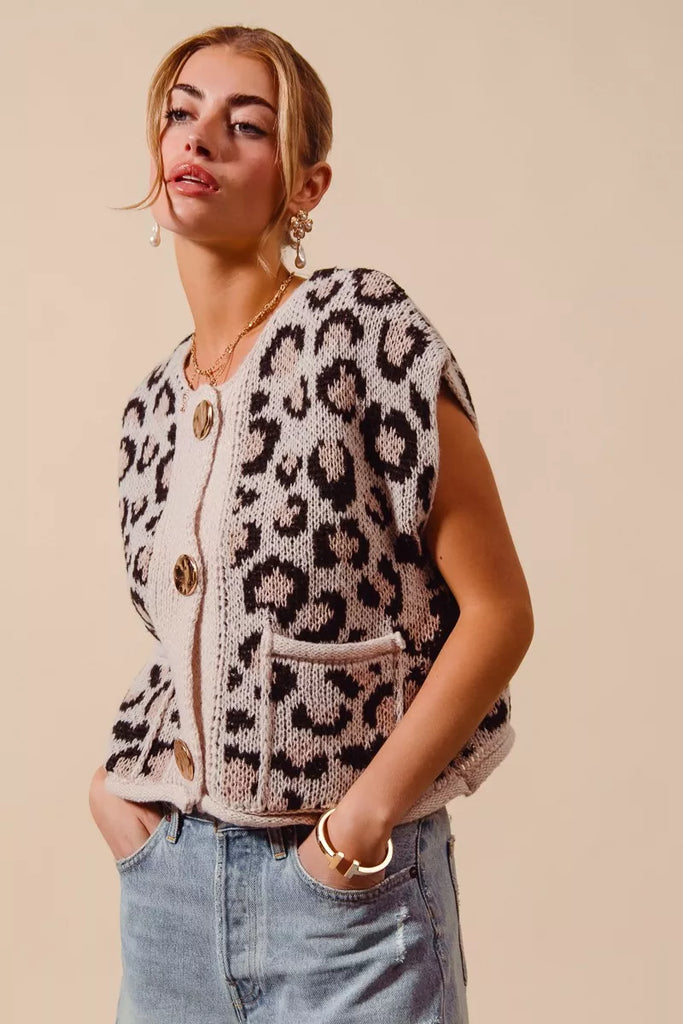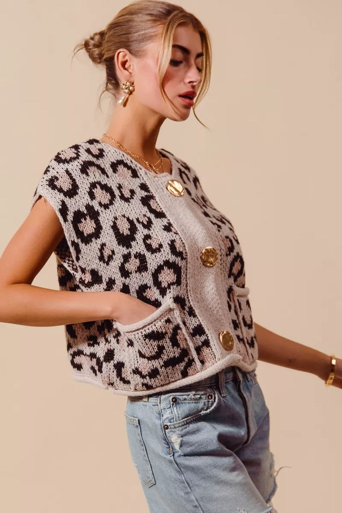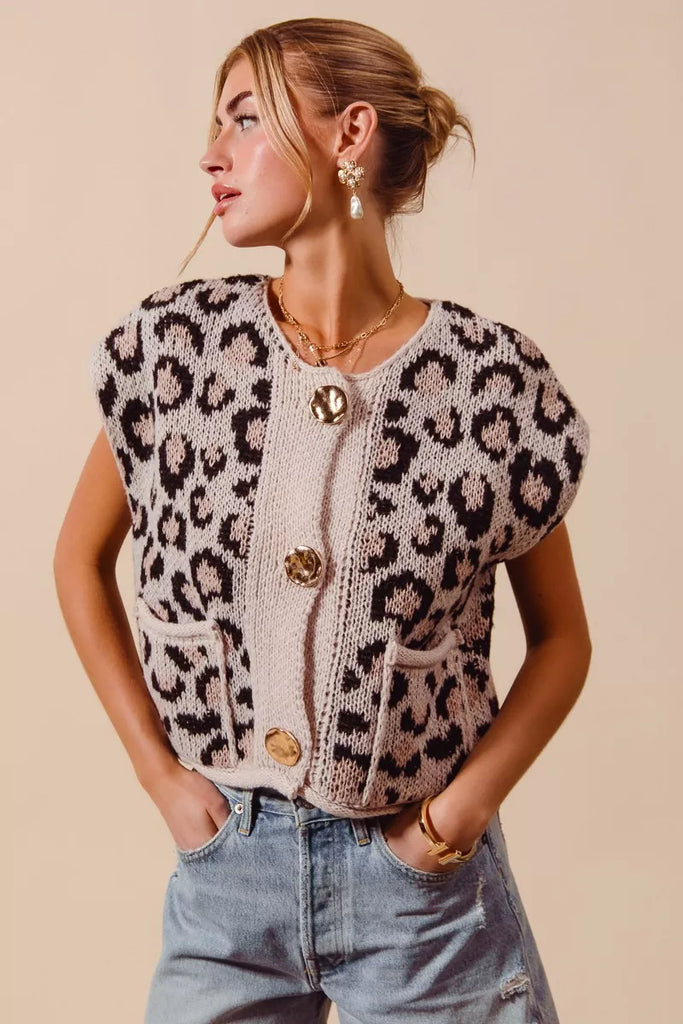 Big Metal Button Front Leopard Sweater Vest Top