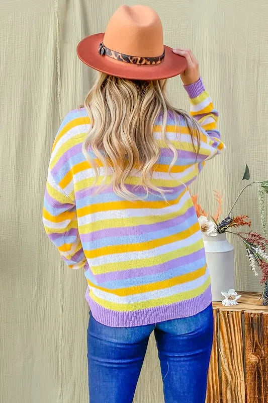 The multi-striped mesh pullover spring sweater is a stylish and lightweight option for transitioning into the warmer seasons. The mesh fabric adds a touch of texture and breathability, making it perfect for layering over a tank top or bralette. The multi-striped pattern offers a playful and colorful look, ideal for adding a pop of color to your spring wardrobe. This sweater is versatile and can be paired with jeans, shorts, or skirts for a trendy and casual outfit.