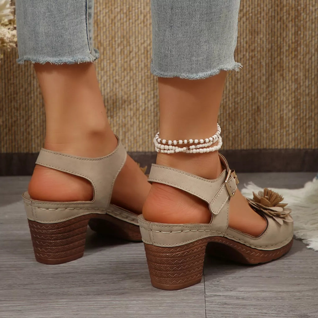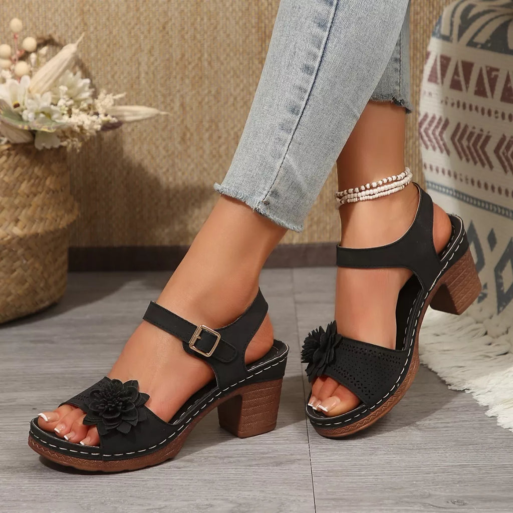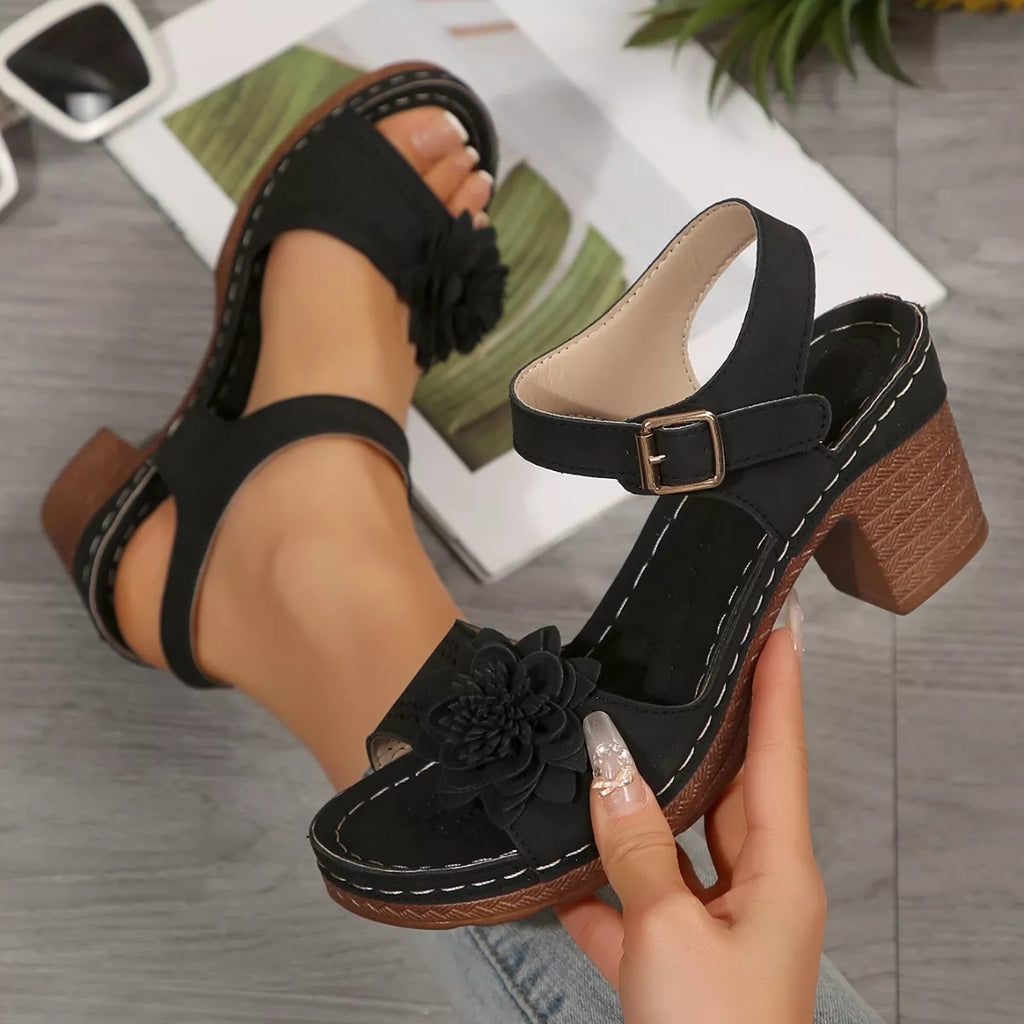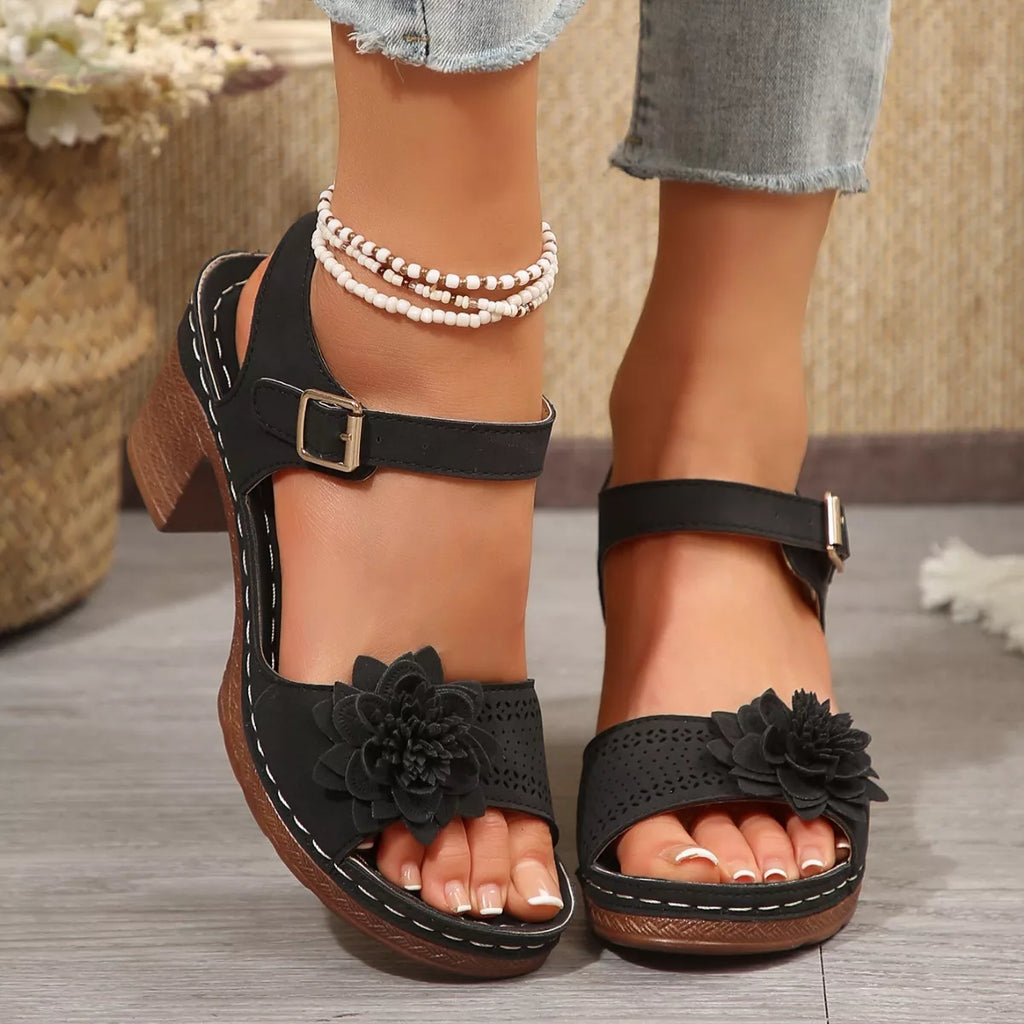 Floral Decor Buckle Ankle Strap Block Heel Sandals