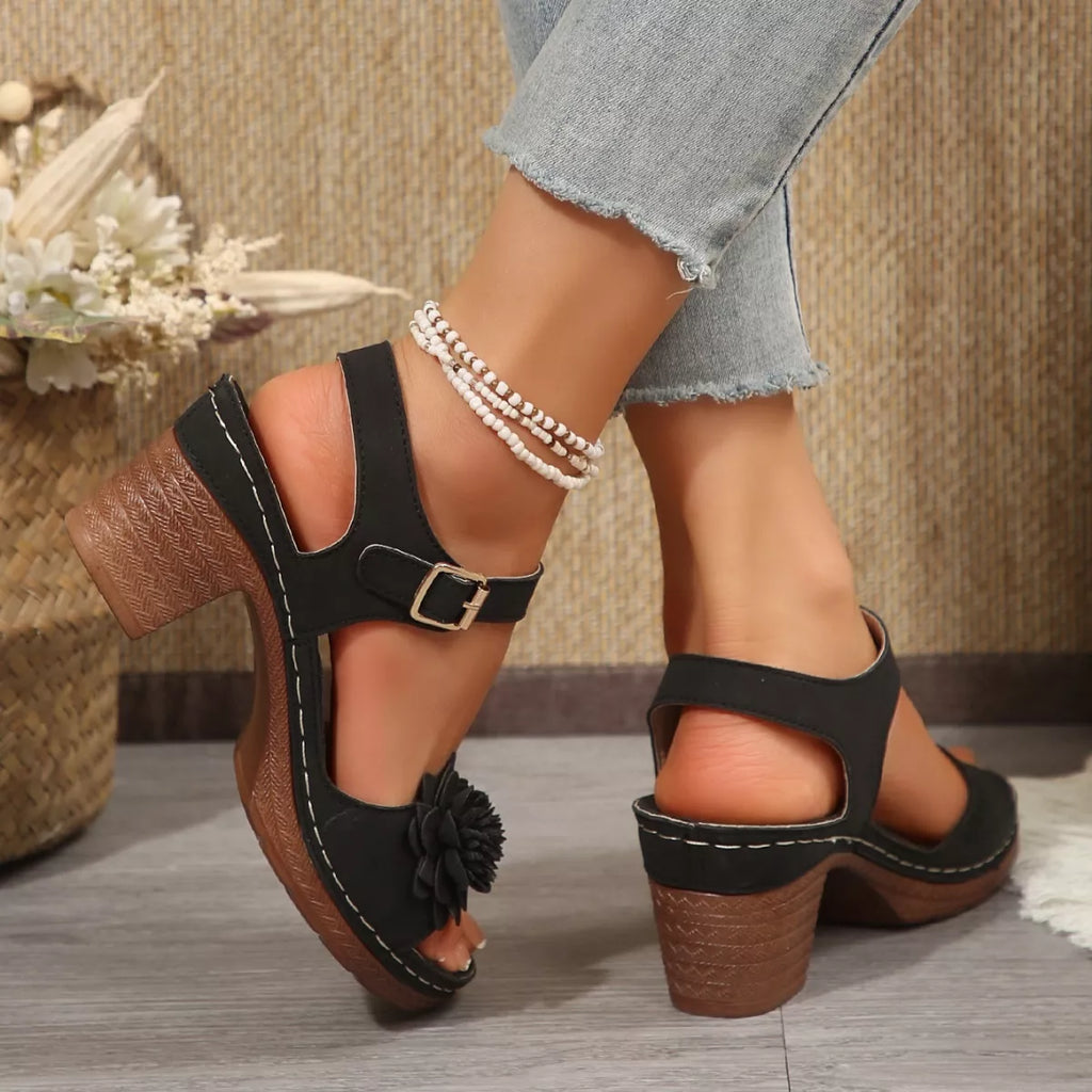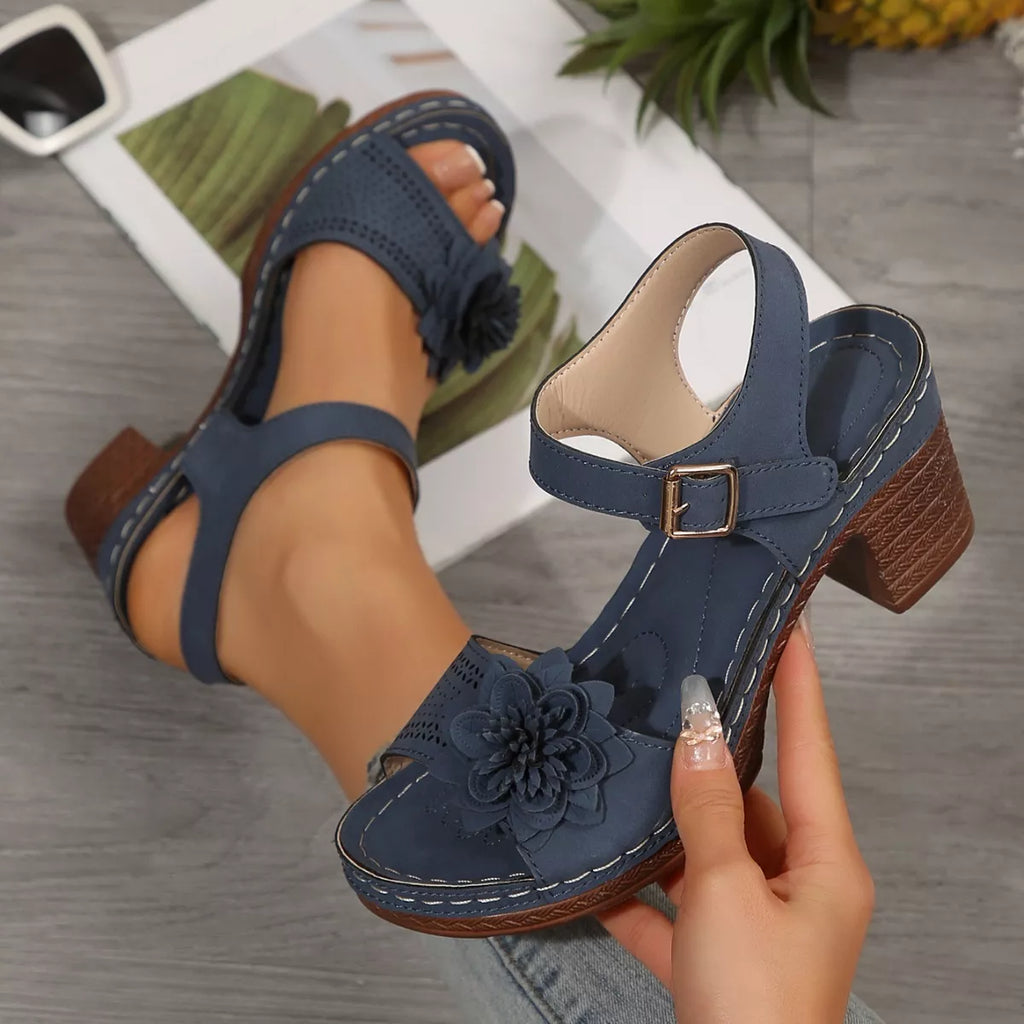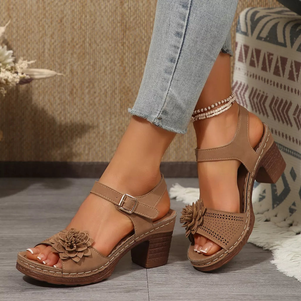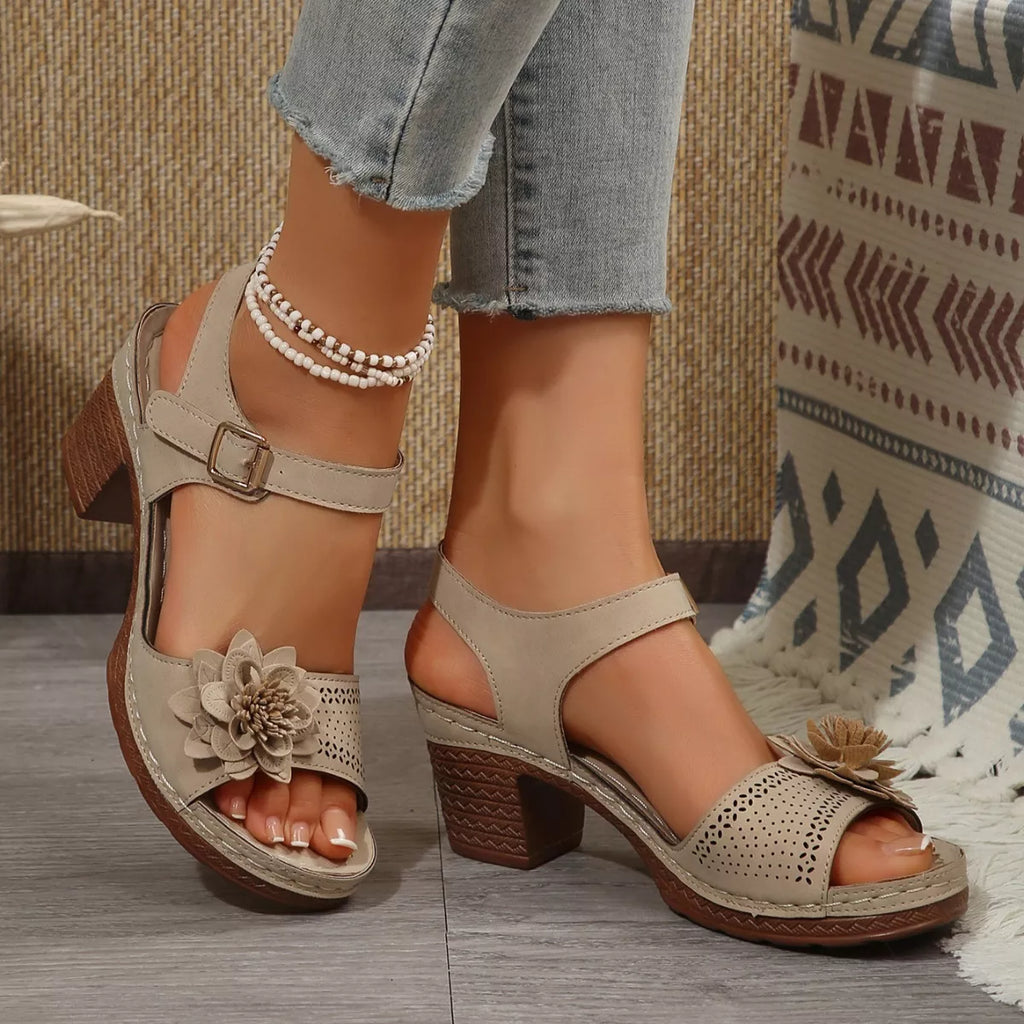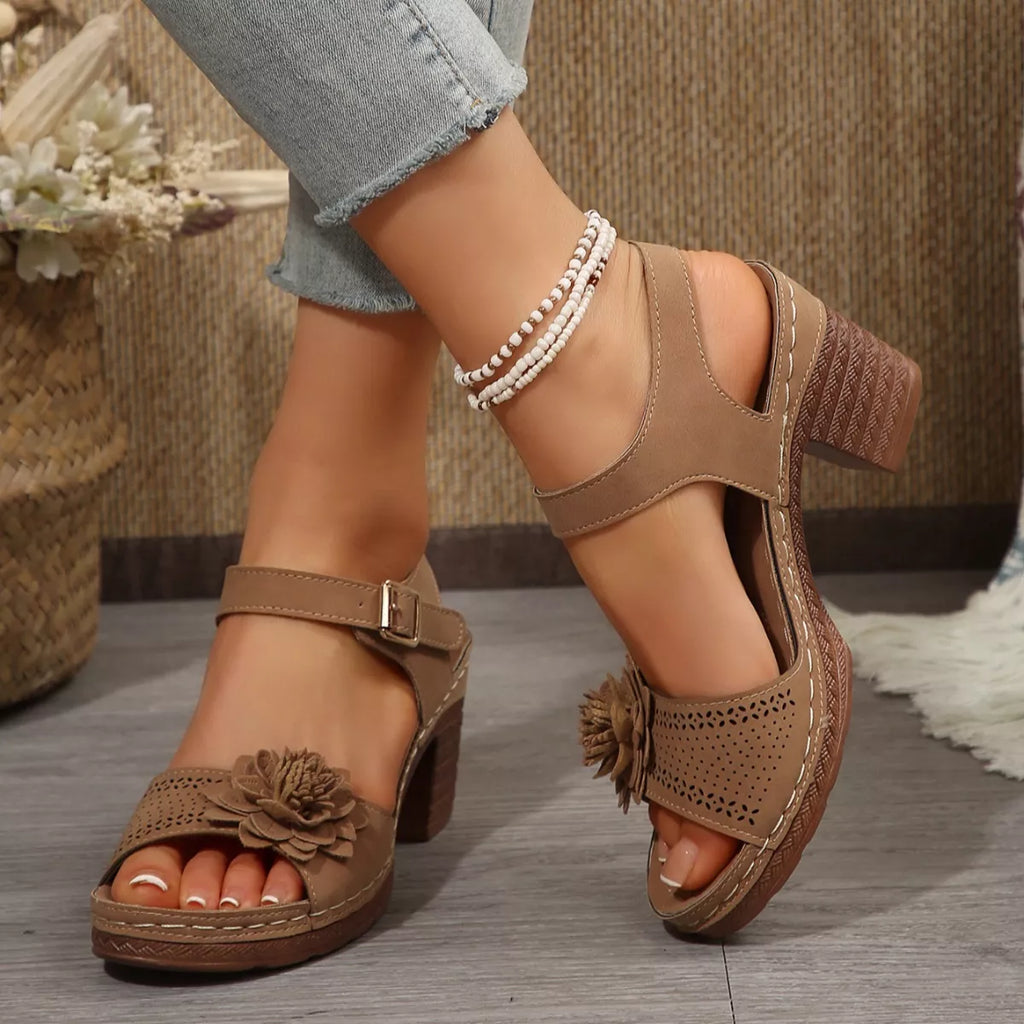 Floral Decor Buckle Ankle Strap Block Heel Sandals