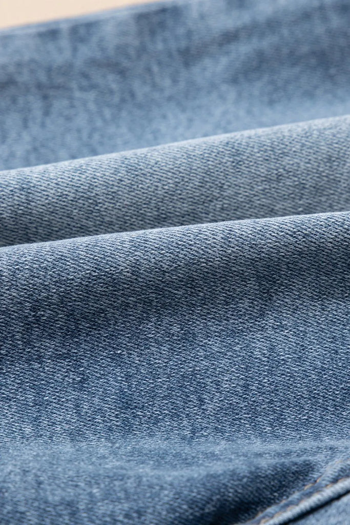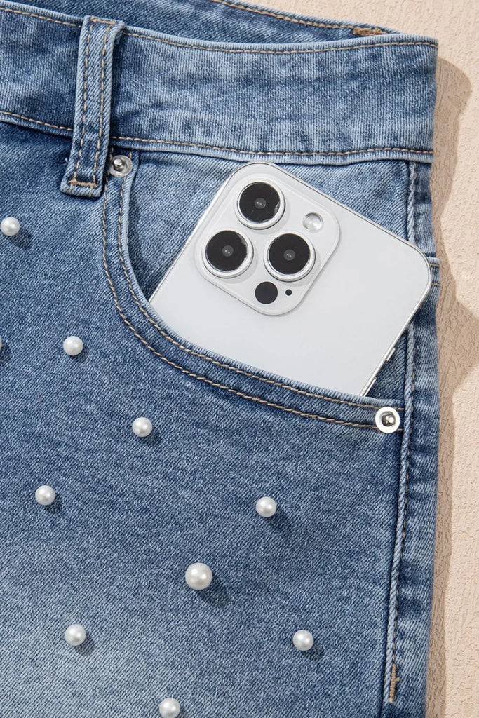 Pearl Beaded Raw Hem Wash Denim Shorts