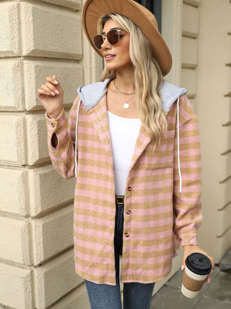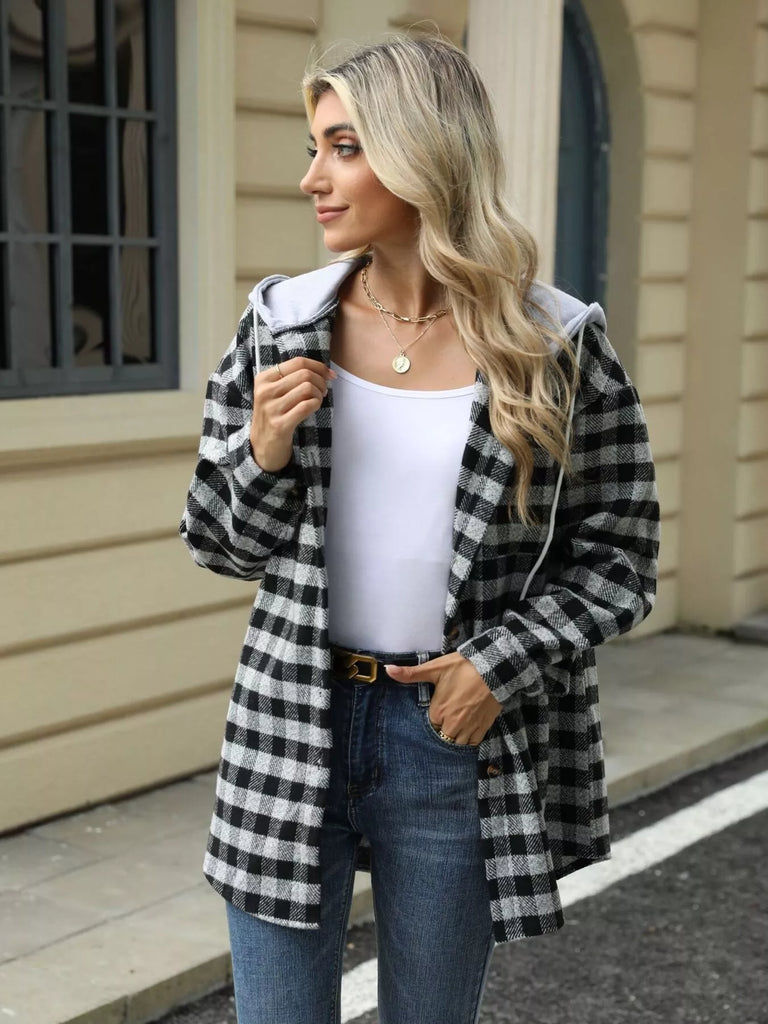 Plaid Button Up Long Sleeve Drawstring Hooded Jacket