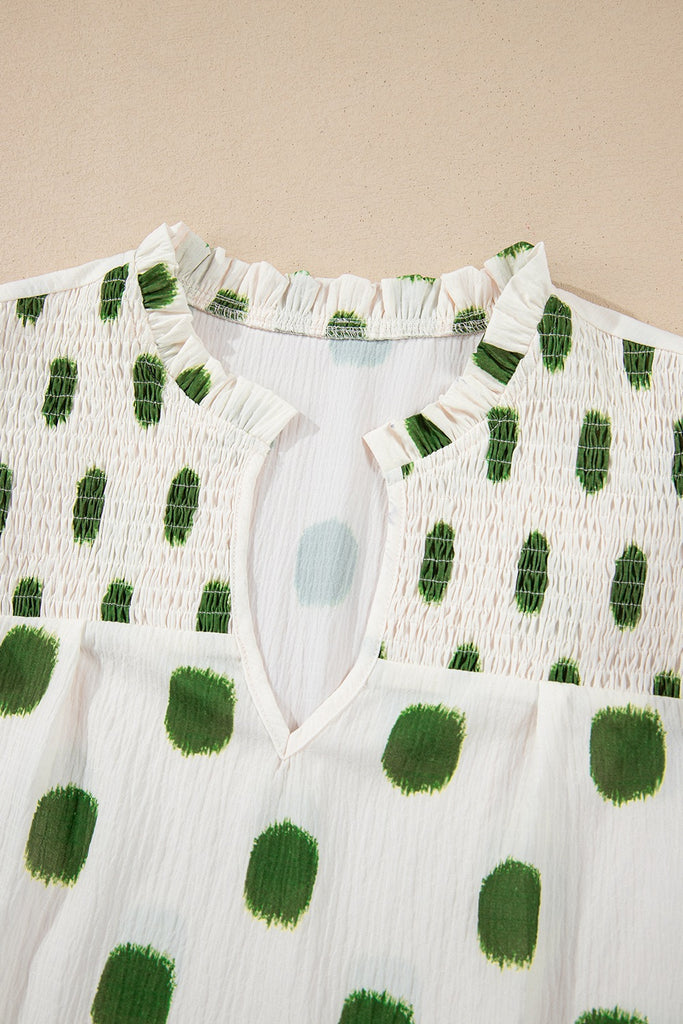 Polka Dot Shirred Yoke Notched Neck Puff Sleeve Blouse