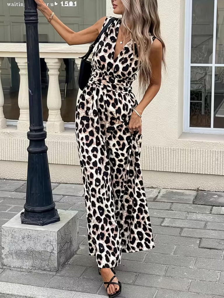Sleeveless V-Neck Leopard Print Wide Leg Jumpsuit