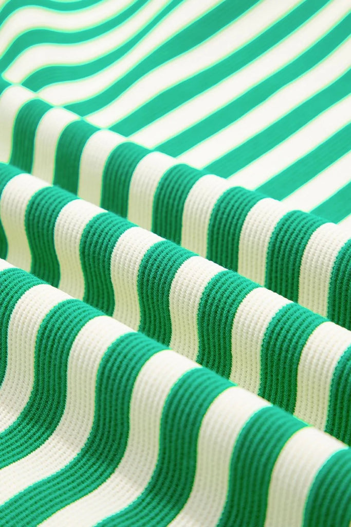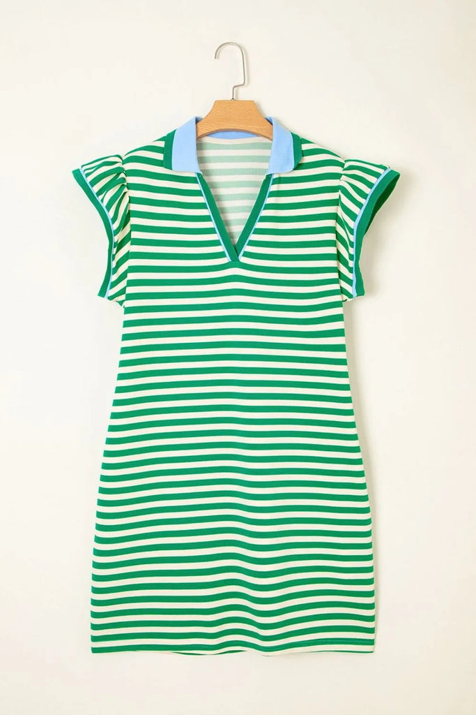 Stripe Print Contrast Collar Split Neck Flutter Sleeve Dress